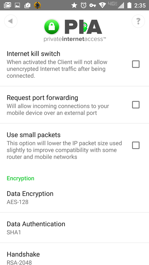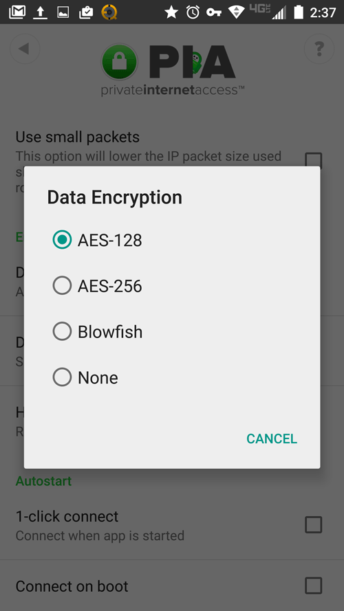 - Encryption: PIA’s Android app lets you adjust the encryption strength. Choose from AES-128, AES-256 or Blowfish.