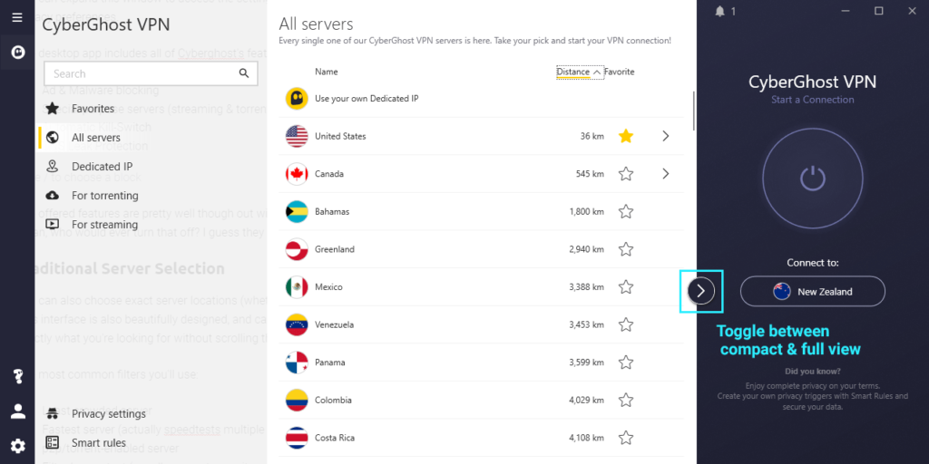To choose one of Cyberghost’s server locations, simply expand the client to the full view and open either the all servers tab, or one of the special-purpose tabs such as For Streaming.